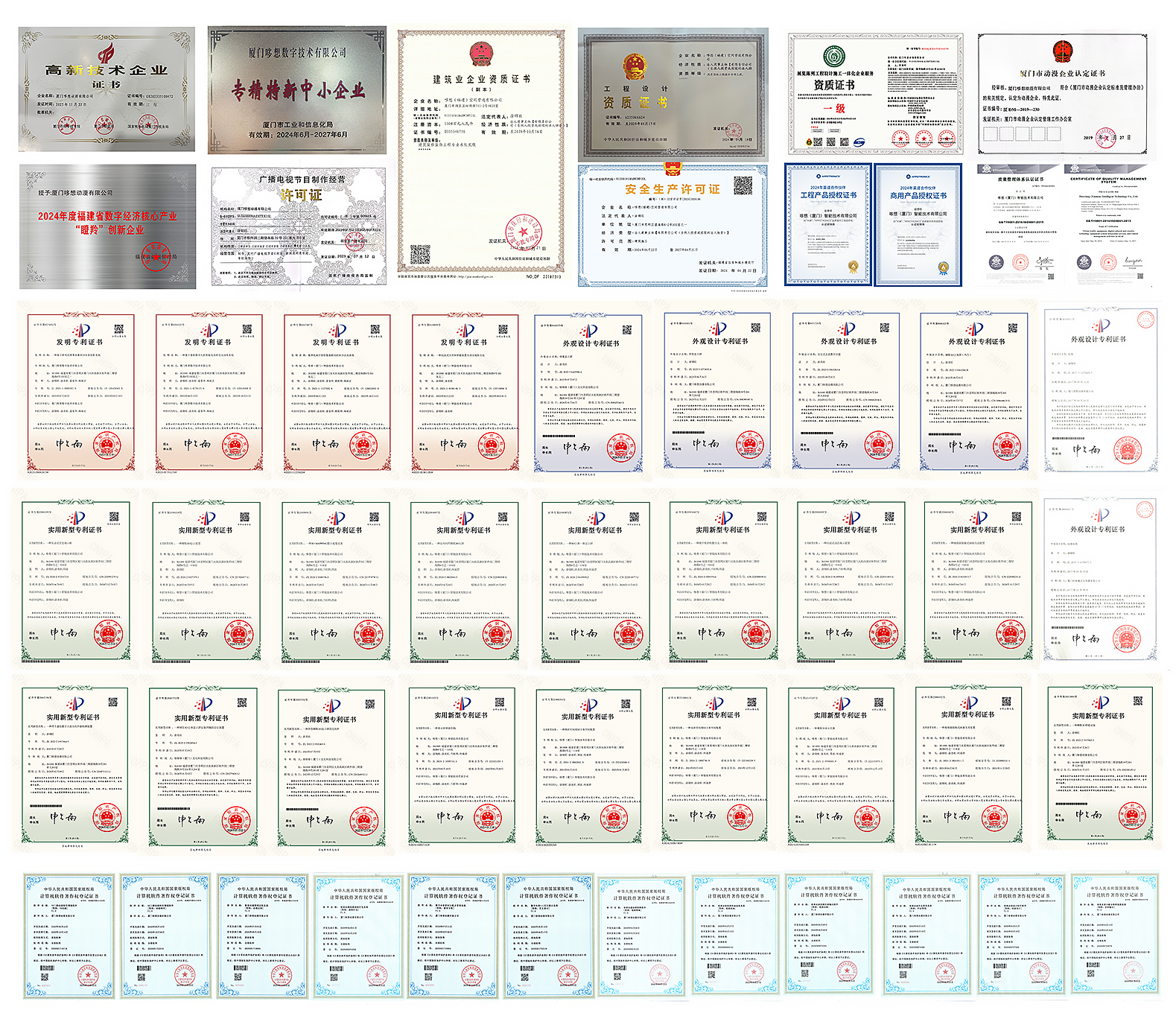 一种裸眼3D智能设备等多项自主专利/多项软件自主版权/多项设计施工认证资质/建筑装修装饰工程专业承包二级/风景园林工程设计专项乙级/展览展厅设计服务认证证书/三大管理体系认证/广播电视节目制作经营许可证/厦门市动漫企业认定证书等。